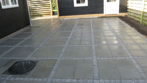 Flise belagt terrasse med anlagt rist til afledning af vand.