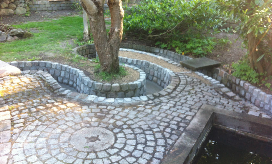 Her er lavet flisebelægning i farvet fliser og belægning af granitskærver.
