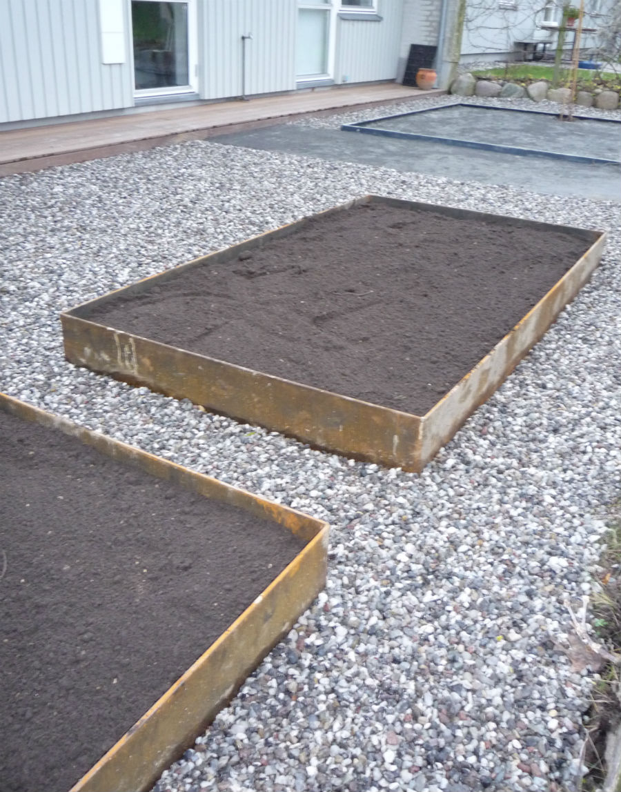 Her er lavet et højbed i træ og beklædt indvendigt, så jord og træ ikke...